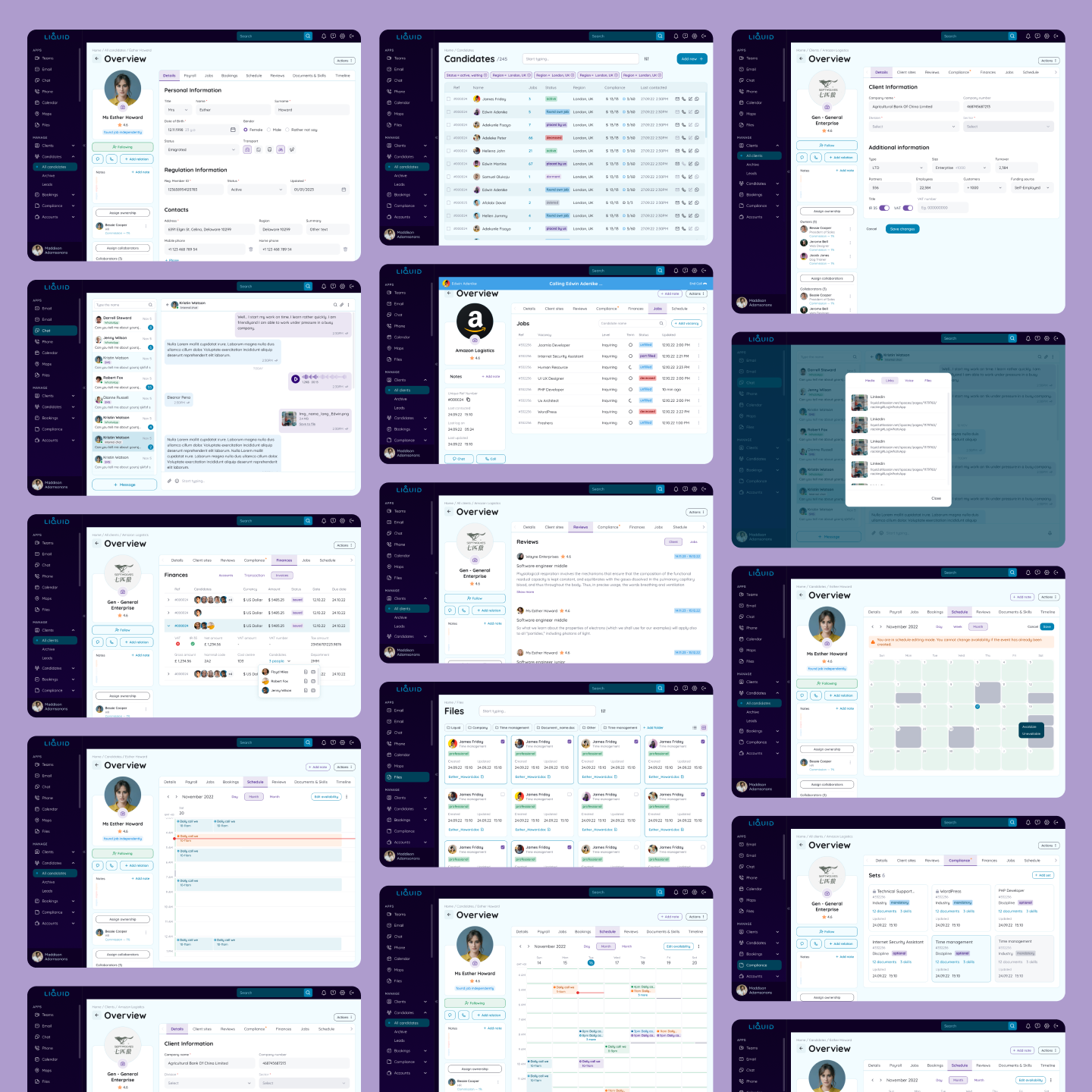 Liquid stands as a robust, high-capacity CRM platform tailored for the recruitment industry. Encompassing a wide array of features, it facilitates hiring, timesheet tracking, invoicing, interview scheduling, and pinpointing the best-matched candidates for specific roles and locations. Users can seamlessly manage staff schedules, access call, chat, and email functions, and efficiently collect and store files—all within a unified system. I personally lead a design team of 10 designers on this project, we designed a complex desktop CRM system, 2 separate mobile apps, a desktop web portal, a Webflow marketing site and created the branding, everything from scratch and fully scalable UI kits for all.